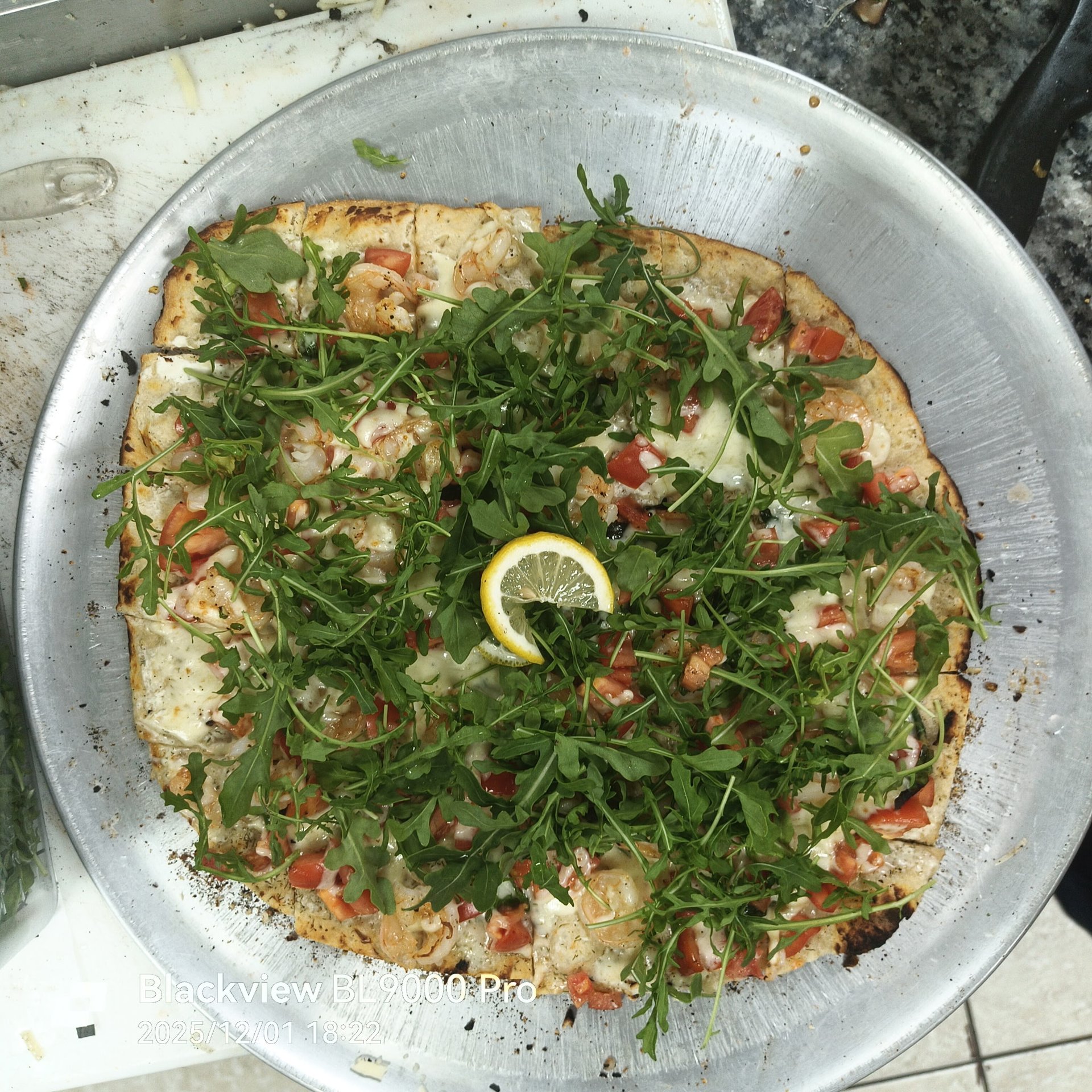 Garlic-Dill Ricotta Cream Sauce, Tomato, Basil, Florida-cost Shrimp, Olive Oil. Topped with Arugula and Parmigiano.