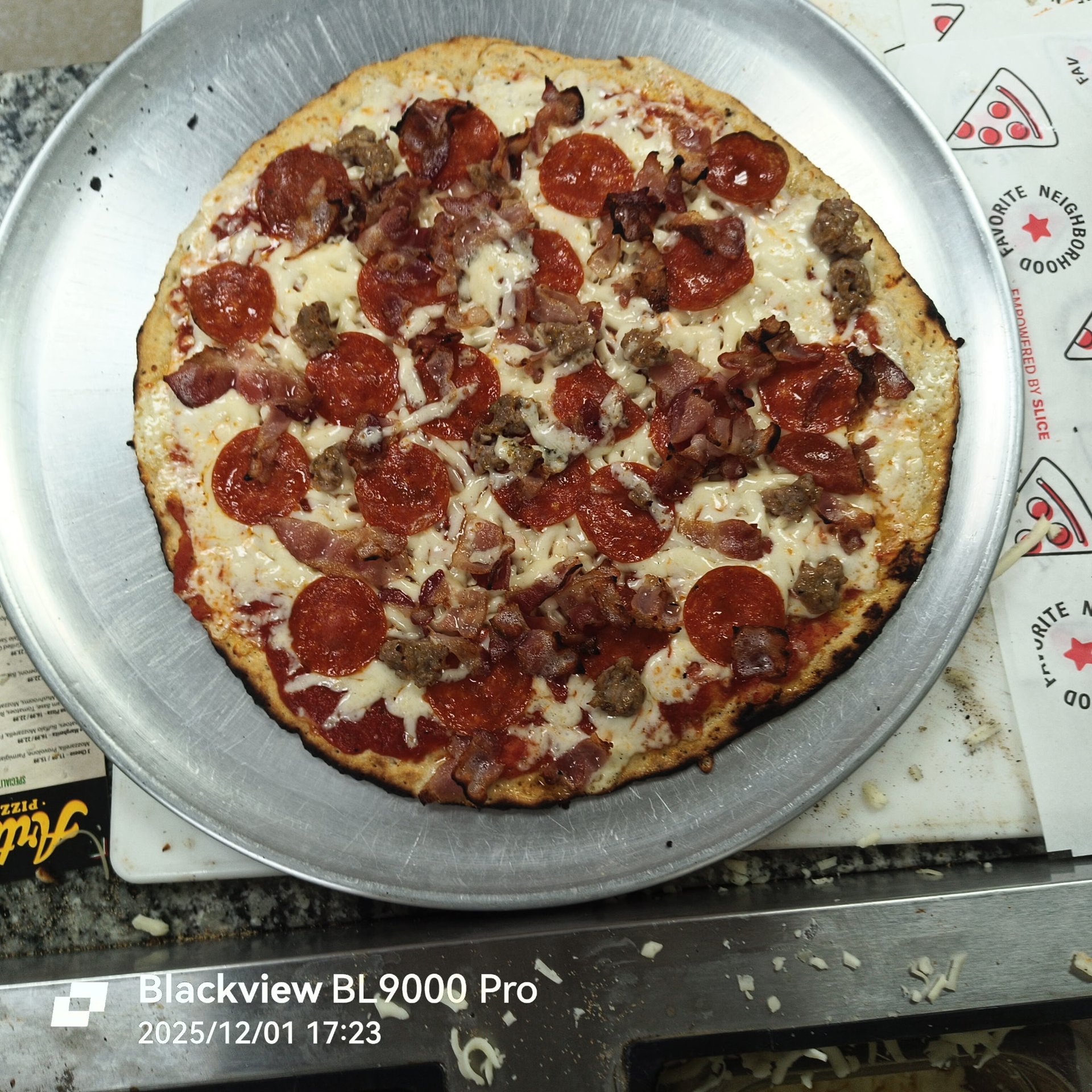 Peperoni, Bacon, Sausage, Pulled Pork, Mozzarella, Provolone, Tomato Sauce.